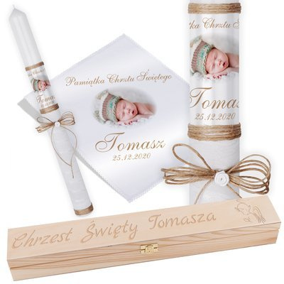 Świeca i szatka na chrzest ze zdjęciem dziecka oraz pudełko kokardka ze sznurka