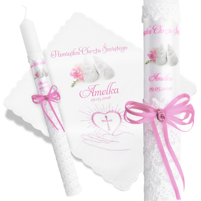 Proponujemy Państwu elegancką świecę oraz szatkę do Chrztu, Komunii ze zdjęciem dziecka lub dedykacją. Świeca jest ręcznie zdobiona grubą koronką w kolorze białym przez co zyskuje swój niepowtarzalny charakter. Dodatkowo ma ona różową kokardkę z delikatnej wstążki.