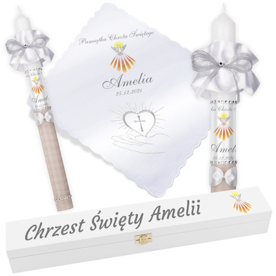 Proponujemy państwu piękny zestaw - świecę do chrztu w czarnym kolorze i szatkę z wyhaftowanym białym sercem na dłoni. Stonowana, kontrastowa kolorystyka nadaje produktom eleganckiego i wyrazistego charakteru. Dzięki szerokiej personalizacji, prezent będzie idealnie dopasowany do maluszka - mają państwo możliwość umieszczenia na świecy i na szatce zdjęcia dziecka/innej grafiki, oraz imienia i daty uroczystości chrztu świętego. Nadruk wykonujemy metodą sublimacji, która polega na wtłoczeniu go do środka tkaniny, dzięki czemu jest wyjątkowo trwały i estetyczny. Prosty i intuicyjny edytor na naszej stronie sprawi, że zaprojektowanie zestawu będzie szybkie i przyjemne. Biała profitka gustownie dopełnia całą kompozycję zestawu. Do świecy dołączamy dedykowane, drewniane pudełko, na którym nadrukujemy imię dziecka z dopiskiem chrzest święty. Nadruk na pudełku wykonujemy metodą UV, dzięki czemu jest wyrazisty i trwały.