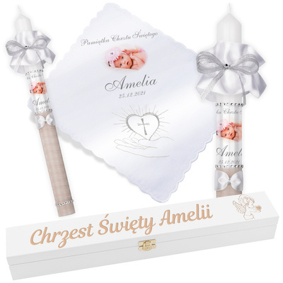 Świeca z pudełkiem i szatką / ze zdjęciem dziecka / na Chrzest personalizacja / Model G26 / Rodzice chrzestni