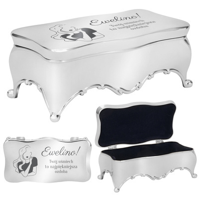 Proponujemy Państwu śliczną szkatułkę na biżuterię, pierwszy ząbek, pukiel włosów lub inne drobiazgi. Przedmiot wykonany jest z wysokiej jakości stali, posrebrzanej i zabezpieczonej lakierem ochronnym, dzięki któremu nie czarnieje i zachowuje swój blask. Wnętrze szkatułki wykończone jest eleganckim welurem.