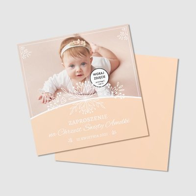 Zaproszenie na chrzest zostanie nadrukowane na białym eleganckim papierze, z wybranym przez Państwa motywem. W tym przypadku cała okładka będzie w kolorze brzoskwiniowym, oprócz miejsca na zdjęcie dziecka oraz środka z dedykacją.