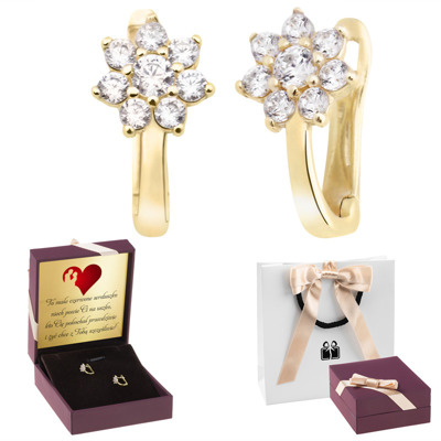 Proponujemy Państwu prześliczne złote kolczyki o eleganckim wzornictwie w kształcie kwiatka wypełnionego cyrkoniami. Biżuteria została wykonana z najwyższej jakości złota próby 333. Upominek wykonany jest ręcznie z niesamowitą dbałością o detale.