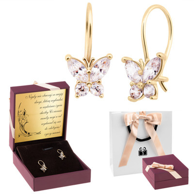 Proponujemy Państwu prześliczne złote kolczyki o eleganckim wzornictwie w kształcie motylka z cyrkoniami.