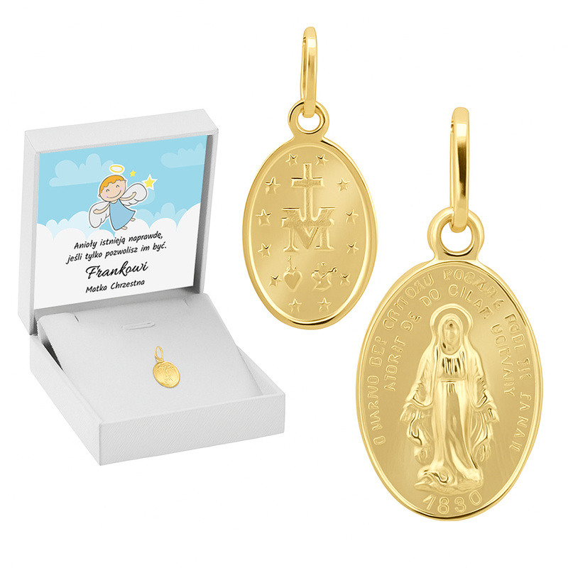 Prezentowany złoty Cudowny Medalik, został wykonany z największą starannością o każdy szczegół. Dookoła Maryi zamieszczono czytelny napis w języku polskim.