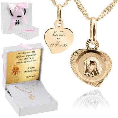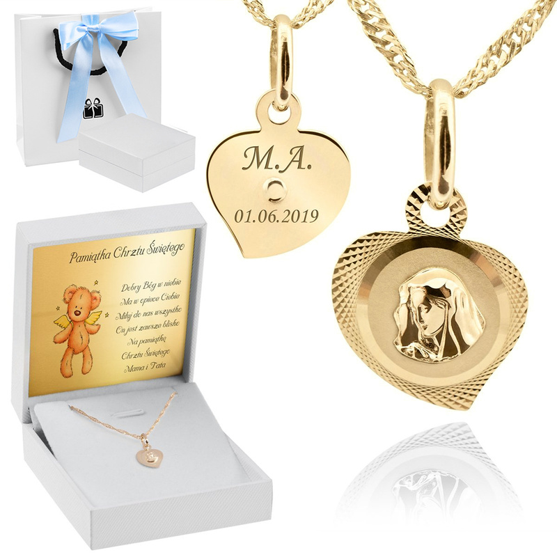 Proponujemy Państwu prześliczny medalik w kształcie serduszka z wizerunkiem Matki Boskiej z indywidualnym grawerem. Medalik i łańcuszek został wykonany najwyższej próby złota 585. Wykonany jest ręcznie z niesamowitą dbałością o detale. Posiada cechę Urzędu probierczego. To nieodłączny element tak ważnej uroczystości jak chrzest, I komunia Święta, Bierzmowanie. To piękna pamiątka na lata. Dzięki indywidualnej dedykacji upominek staję się unikatowy.