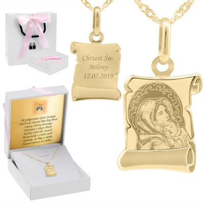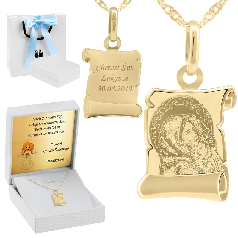 Proponujemy Państwu prześliczny komplet medalik z wizerunkiem Matki Boskiej z Dzieciątkiem z indywidualnym grawerem. Medalik i łańcuszek został wykonany z najwyższej próby złota 585. Posiada cechę Urzędu probierczego.