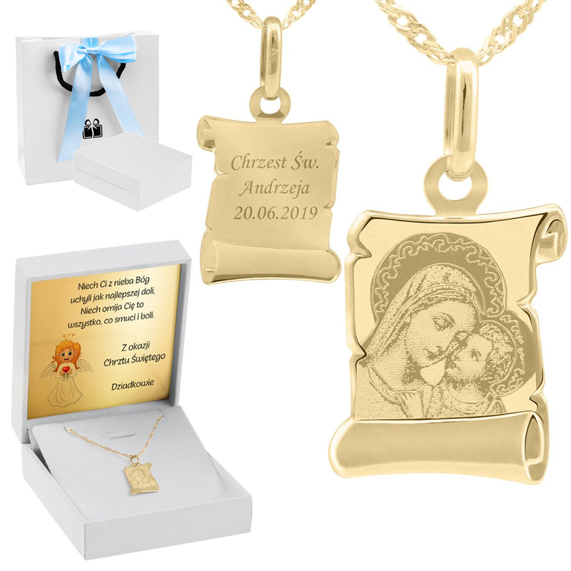 Proponujemy Państwu prześliczny komplet medalik z wizerunkiem Matki Boskiej z Dzieciątkiem z indywidualnym grawerem. Medalik i łańcuszek został wykonany z najwyższej próby złota 585. Posiada cechę Urzędu probierczego.