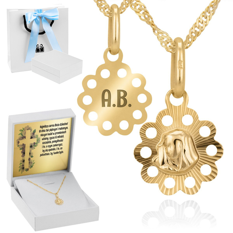 Proponujemy Państwu prześliczny komplet medalik z wizerunkiem Matki Boskiej z indywidualnym grawerem. Medalik i łańcuszek został wykonany z najwyższej próby złota 585. Posiada cechę Urzędu probierczego.