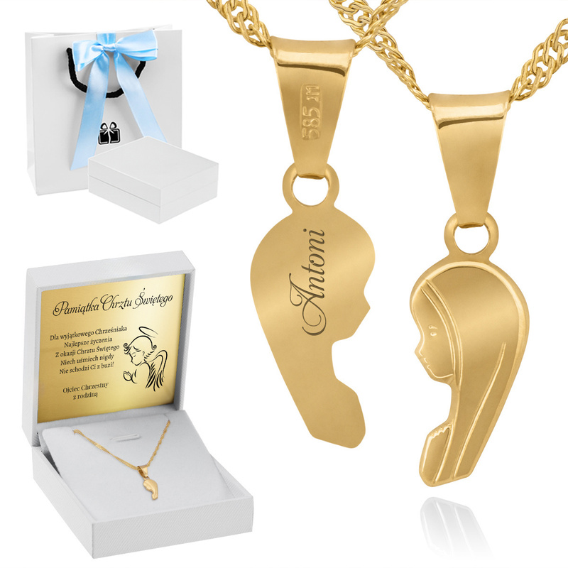 W komplecie znajduje się także elegancki i klasyczny łańcuszek złoty, próby 585. Singapur to jeden z bardziej efektownych splotów, świetnie komponuje się z medalikami. Całość upominku zostaje zapakowana w ozdobne pudełeczko ze spersonalizowaną tabliczką dedykacyjną w środku. To wspaniała pamiątka!