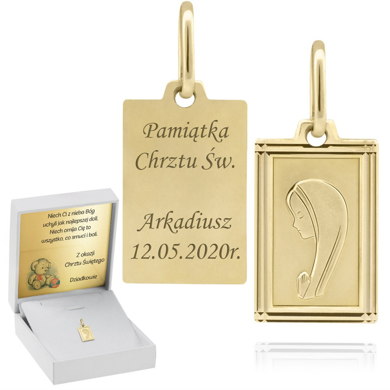 Proponujemy Państwu prześliczny medalik z wizerunkiem Matki Boskiej z indywidualnym grawerunkiem na rewersie medalika oraz dedykacją na tabliczce w pudełku. Medalik został wykonany najwyższej próby złota 585. Wykonany jest ręcznie z niesamowitą dbałością o detale. Posiada Cechę Urzędu Probierczego. To nieodłączny element tak ważnej uroczystości jak Chrzest, I Komunia Święta czy Bierzmowanie. To piękna pamiątka na lata. Dzięki indywidualnemu grawerunkowi upominek stanie się unikatowy!