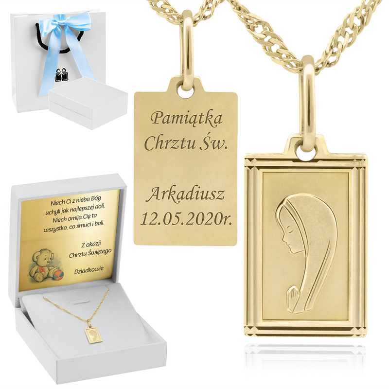 Proponujemy Państwu prześliczny medalik z wizerunkiem Matki Boskiej z indywidualnym grawerunkiem na rewersie medalika oraz dedykacją na tabliczce w pudełku. Medalik został wykonany najwyższej próby złota 585. Wykonany jest ręcznie z niesamowitą dbałością o detale. Posiada Cechę Urzędu Probierczego. To nieodłączny element tak ważnej uroczystości jak Chrzest, I Komunia Święta czy Bierzmowanie. To piękna pamiątka na lata. Dzięki indywidualnemu grawerunkowi upominek stanie się unikatowy!
