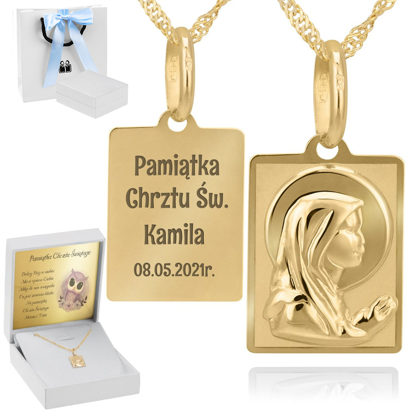 Złoty prostokątny medalik z łańcuszkiem próba 585 Matka Boska Chrzest Komunia Bierzmowanie Grawer